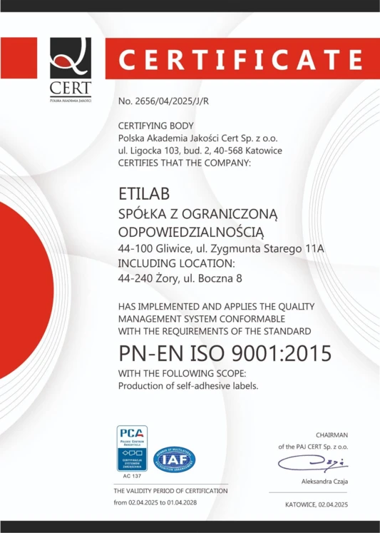 Gliwicessä sijaitsevan Etilab Sp. z o.o.:n toinen ensisijainen tavoite on täyttää jatkuvasti asiakkaidemme vaatimukset saavuttamalla ja ylläpitämällä korkea laatutaso itseliimautuvien etikettien tuotannossa ja takaamalla, että käsiteltyjen tietojen turvallisuus säilyy täysin turvallisena.